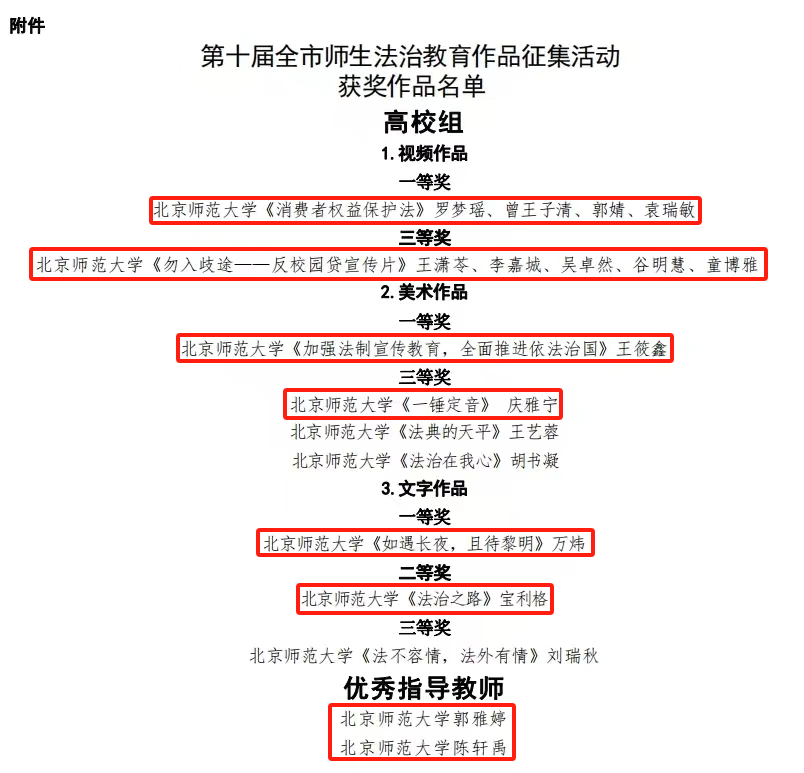 In order to thoroughly study and implement President Xi Jinping's thoughts on the rule of law, implement the spirit of the 20th National Congress of the Communist Party of China, continue to implement the work arrangements of the Central Committee and the CPC Beijing Municipal Committee on strengthening the construction of socialist rule of law culture, and further promote the spirit of constitutional rule of law, the Beijing Municipal Education Commission launched the 10th Beijing Teachers and Students Excellent Legal Education Works Collection Activity and the "Learn the Constitution and Publicize the Constitution" series activity for students across the city. The teachers and students of the Law School of Beijing Normal University achieved great success in the activities.