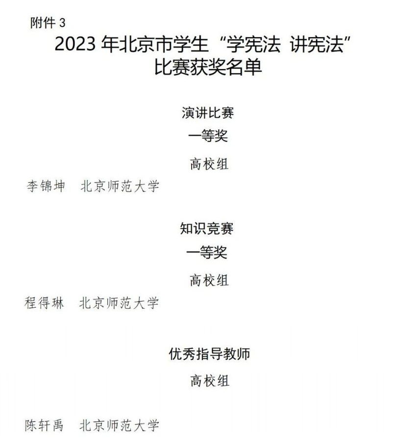 Recently, the Beijing Municipal Education Commission announced the list of winners of the “Learn the Constitution and Publicize the Constitution” series activity. After recommendations from various units, self-recommendations from students in the preliminary selection session, expert reviews, and a city-level final review, the event was divided into four groups: primary school, junior high school, high school, and college. Finally, first, second, and third prizes for the speech contest and knowledge contest, as well as several awards for outstanding instructors, were awarded. Teachers and students of the Law School stood out: Li Jinkun won the first prize in the speech contest; Cheng Delin won the first prize in the knowledge contest; Chen Xuanyu won the Outstanding Instructor Award.