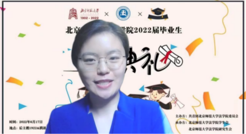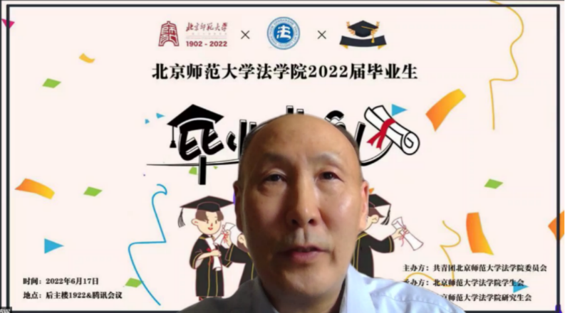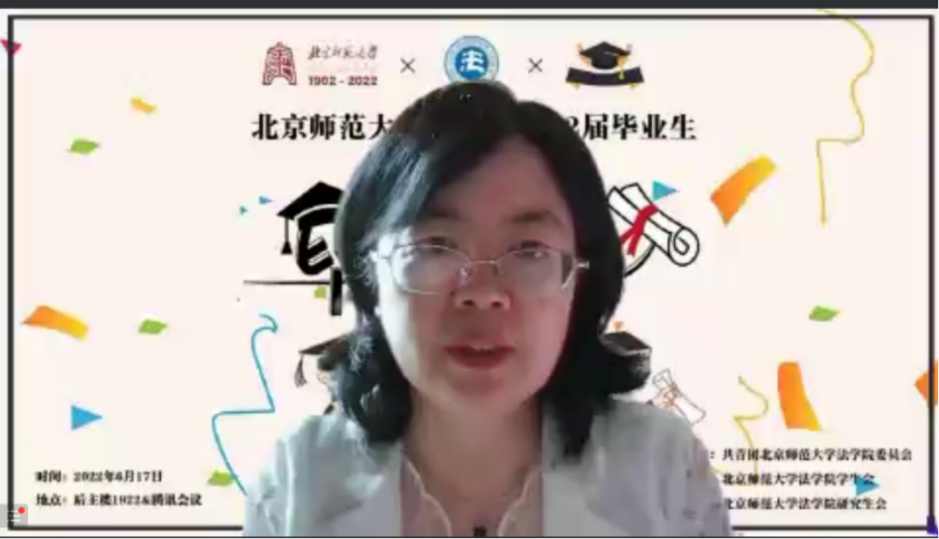 Guests attending the ceremony online include: Professor Gao Mingxuan, Honorary Dean of the College for Criminal Law Science of Beijing Normal University, Professor Song Yinghui of the School of Law of Beijing Normal University, Lawyer Zhao Chunyu, the donor of Chunhui Criminal Defense Scholarship, alumni representing exemplary individual of the National Court, Judge Cai Xiu of the Beijing Higher People's Court, Professor Liang Yingxiu, Dean of the School of Law of Beijing Normal University, Professor Chai Rong, Secretary of the Party Committee and Vice Dean of the School of Law, Professor Yin Jianfeng, Vice Dean of the School of Law, Professor Li Bin, Class Head of Class 3 of 2019 JM program, Professor Yuan Zhijie, Vice Dean of the School of Law, Professor He Ting, Vice President of the College for Criminal Law Science, Associate Professor Yan Houfu, Chairman of the Trade Union of the School of Law, and Professor Li Bin Associate Professor Lao Jiaqi of the College, Professor Wang Qinghua, head teacher of Class 1 of 2019 LL.D. program, and Professor Jia Jidong, head teacher of Class 2 of 2019 LL.D. program, Associate Professor Shang Haowen, head teacher of Class 2 of 2019 LL.M. program, Professor Jia Wanting, head teacher of the 2018 Maxdo Experimental Class in Law, Professor Maria, head teacher of the 2018 Elite Experimental Class in Law, Professor Qi Shufeng, head teacher of Class 2 of 2019 JM program, Professor Huang Xiaoliang, Professor Zhang Lei, Associate Professor Liu Ke, Associate Professor He Dan, Associate Professor Yang Xiong, Associate Professor Zhao Chengguang, Professor Li Xiaoxiao, Professor Guo Ye, Professor Li Di, Professor Shi Min, and other teachers who attended the graduation ceremony online.