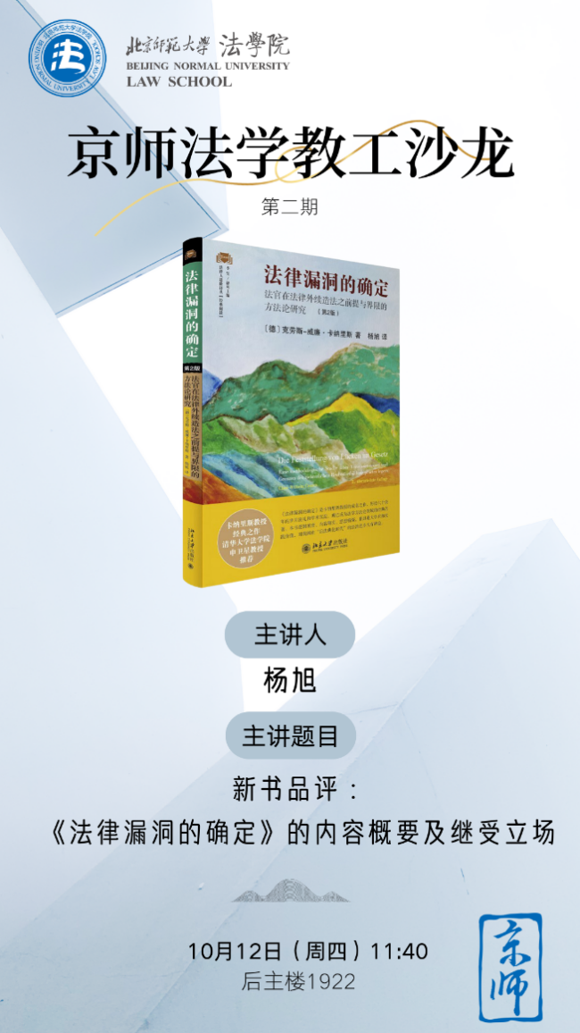 10月12日,北师大嘟嘟成人网 举行本学期第二期“京师法学教工沙龙”。本次沙龙的主题是针对《法律漏洞的确定:法官在法律外续造法之前提与界限的方法论研究(第2版)》的新书品评,嘟嘟成人网 杨旭老师主讲《法律与法的评价互动:卡纳里斯的法律漏洞确定理论评述》。嘟嘟成人网 工会主席严厚福副教授主持本次沙龙。