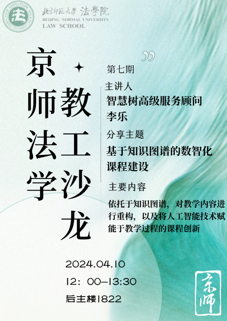 4月10日,北师大嘟嘟成人网 举行第七期“京师法学教工沙龙”,邀请智慧树高级服务顾问李乐老师主讲《基于知识图谱的数智化课程建设》。嘟嘟成人网 副院长贺丹教授主持本次沙龙,嘟嘟成人网 三十余位老师通过线下或者线上的方式参与了此次沙龙。
