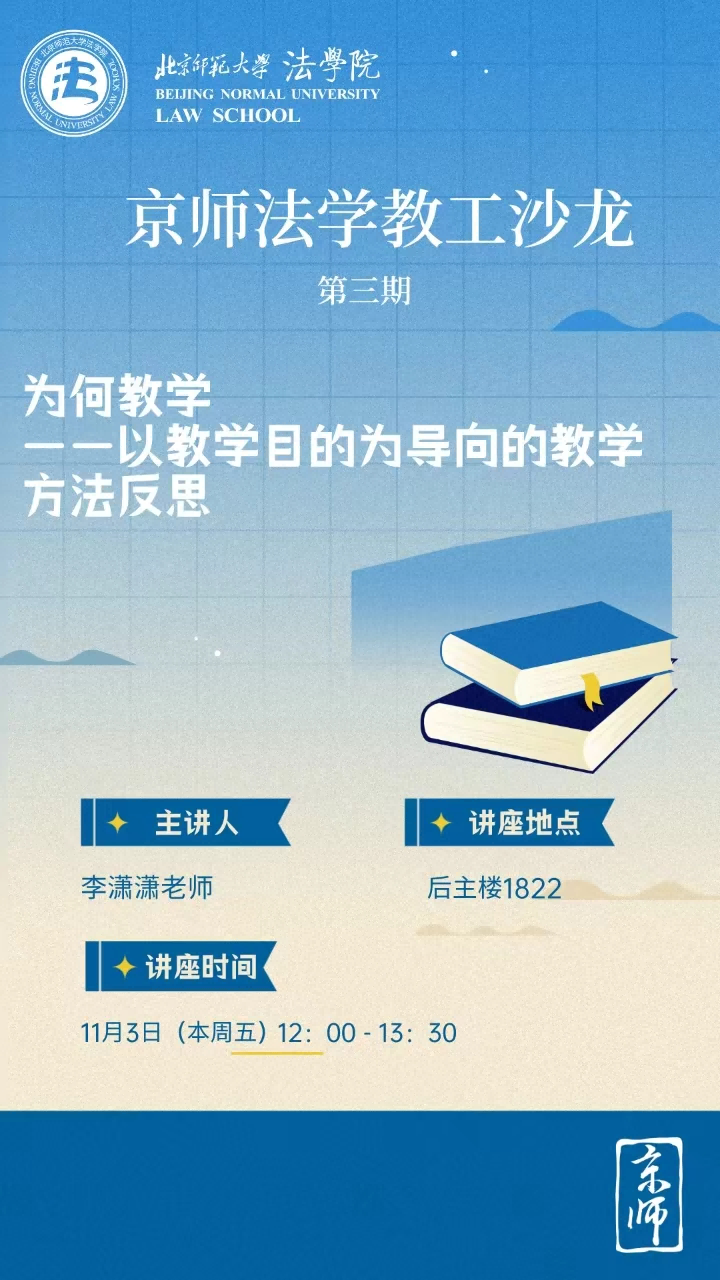 11月3日,北师大嘟嘟成人网 举行本学期第三期“京师法学教工沙龙”,由李潇潇老师主讲《为何教学——以教学目的为导向的教学方法反思》。本次沙龙同时也是北师大校工会举办的青年教师交流沙龙的一部分。嘟嘟成人网 工会主席严厚福副教授主持本次沙龙。校工会副主席王远老师、校工会负责青年教师交流沙龙工作的孙梦寒老师以及嘟嘟成人网 二十余位老师线下参会,北师大北京校区、珠海校区各学部院系的十余位老师通过线上的方式参会。