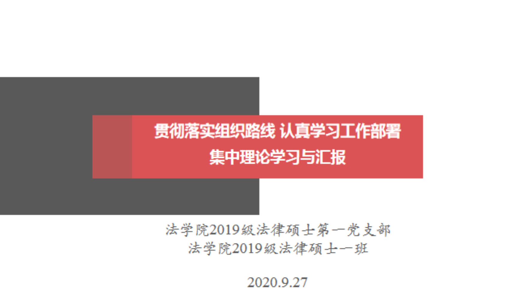 为深入学习贯彻习近平总书记在十九届中央政治局第二十一次集体学习时的讲话“贯彻落实新时代党的组织路线 不断把党建设得更加坚强有力”以及组织学习习近平在经济社会领域专家座谈会上的讲话、习近平在中央第七次西藏工作座谈会上的讲话、习近平对制止餐饮浪费行为作出的重要指示等,2019级法律硕士第一党支部联合2019级法律硕士一班于2020年9月28日晚19:00开展了专题理论学习与汇报会议。2019级法律硕士第一党支部27名党员和29名入党积极分子参会。