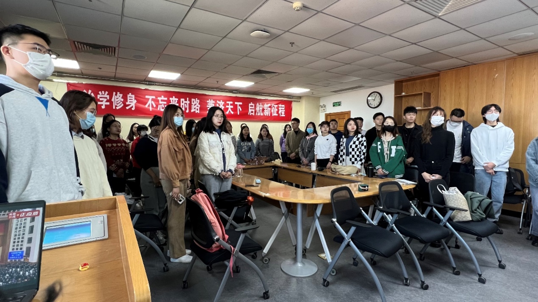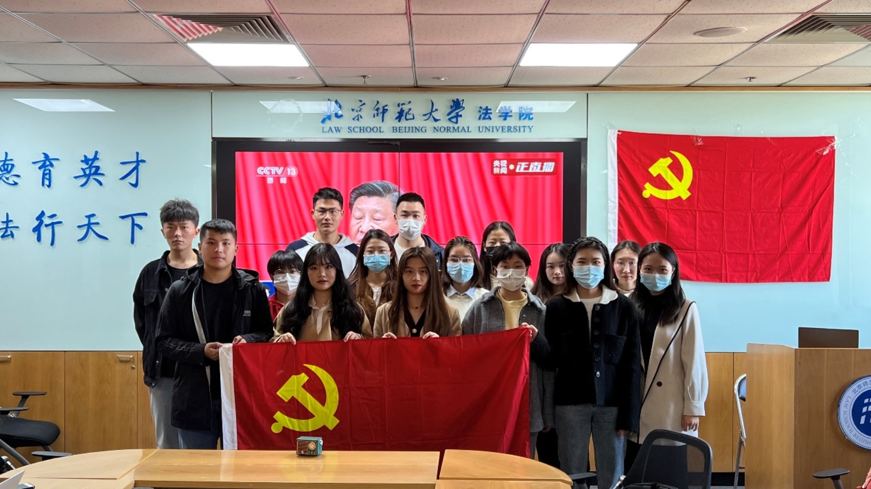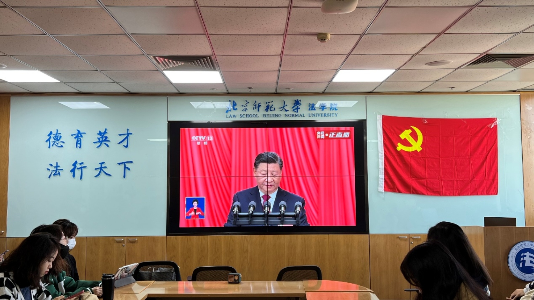 10月16日上午,举世瞩目的中国共产党第二十次全国代表大会在人民大会堂隆重开幕,习近平总书记代表十九届中央委员会向大会作报告。嘟嘟成人网 2022级法律硕士第二党支部、2022级法律硕士第三党支部的全体党员在后主楼1922教室共聚一堂,共同聆听这次重要的会议报告。会场内鲜红的党旗分外醒目,气氛隆重而热烈。