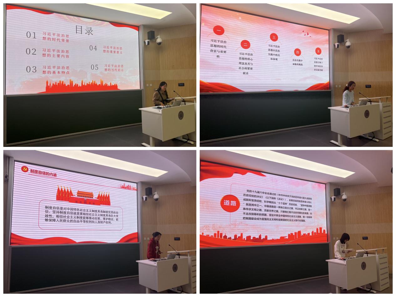 第七组张昕毅同学分享了通过学习和探讨党对全面依法治国的领导这一思想要义,小组成员体会党在全面依法治国进程中的领导核心作用,并深入讨论了这一思想在大学生学习生活中如何落实,青年们深刻认识到个人的命运与国家、社会的命运紧密相连,坚持中国共产党的领导,能够更有组织、更有力量地为社会做出贡献,在实现全面依法治国的征程中发挥个人作用,创造无愧于时代、无愧于人民的业绩。第十一组陶钰涵同学的展示围绕习近平法治思想的提出背景,对习近平法治思想的基本思想、核心特征及其核心要义等关键内容,进行了详尽的解读与阐述,带领大家深入学习了中华人民共和国宪法在中国式现代化进程中的重要作用,深刻学习理解了习近平法治思想中的“三新”、“三基”、“六论”等理论范式,以及三个“核心要义”、五个必须长期坚持的“基本原则”,引导大家从理论走进实践。