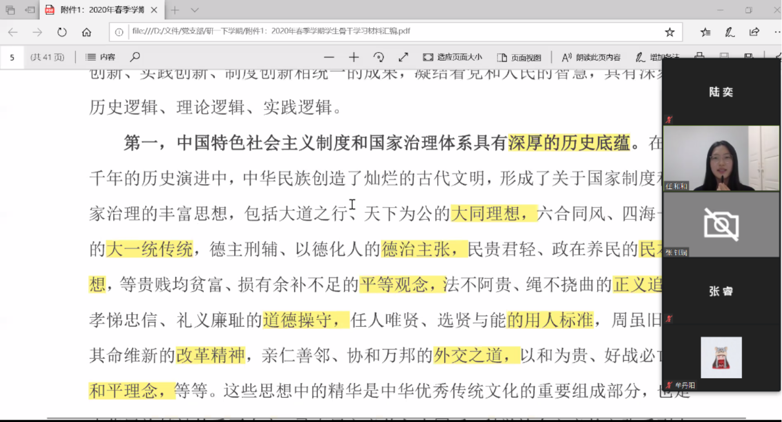 之后,党支部书记任和和带领党员和入党积极分子集中学习了下发的理论学习材料,并重点解读了《坚持和完善中国特色社会主义制度推进国家治理体系和治理能力现代化》和《关于加强党的领导、为打赢疫情防控阻击战提供坚强政治保证的通知》,她指出中国特色社会主义制度的优越性以及共产党人的初心和使命使我们都经受住了疫情考验,我们要不忘初心、继续前行。