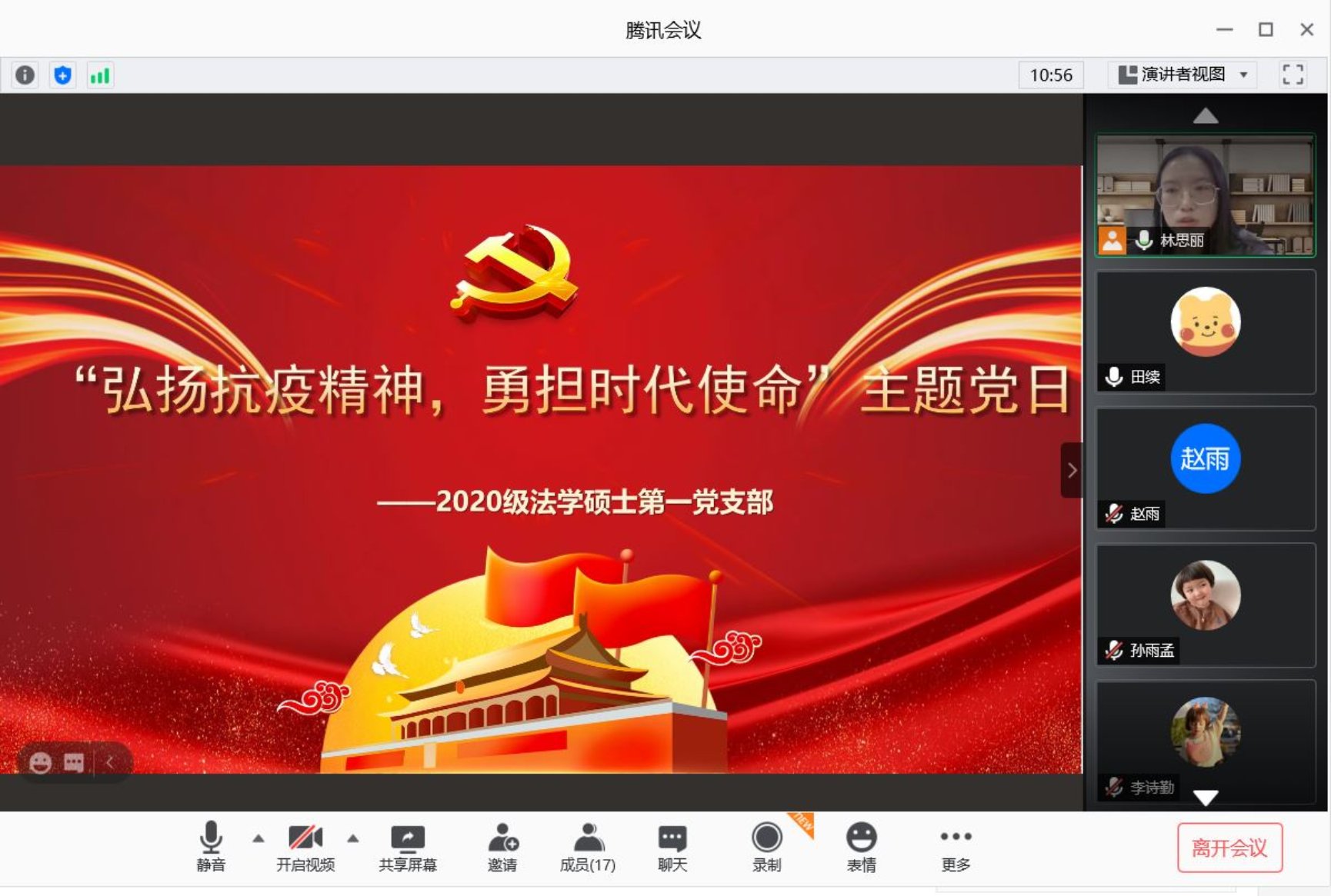 入学伊始,正逢全国抗击新冠肺炎疫情表彰大会举行,为了学习贯彻习总书记在抗击新冠肺炎疫情表彰大会上的讲话精神,增强学生党员教育,保证党内组织生活。926日晚,2020级学硕第一党支部在线上召开以“弘扬抗疫精神,勇担时代使命”为主题的主题党日活动。本次会议共17人参加,其中正式党员应到16人,实到16人,入党积极分子黄牧晨进行旁听,党支部书记林思丽进行主持