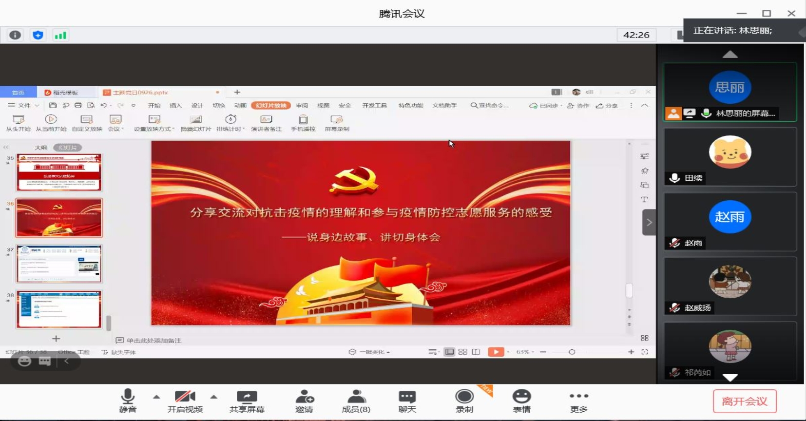 林思丽同志率先发言,她说:“在疫情期间,我于4-7月在校工作,看到学校、社区所做的扎扎实实的疫情防控工作,感到非常踏实而幸福。而这种安全感从疫情之初一直延续到现在,这份安全感的背后,是千千万万医务人员“白衣为甲、逆行出征”、是全中国人民“风雨同舟、众志成城”、是党中央“统揽全局、果断决策,以非常之举应对非常之事”……我不禁为自己生长在这样一个伟大的国家而感到骄傲、自豪!”