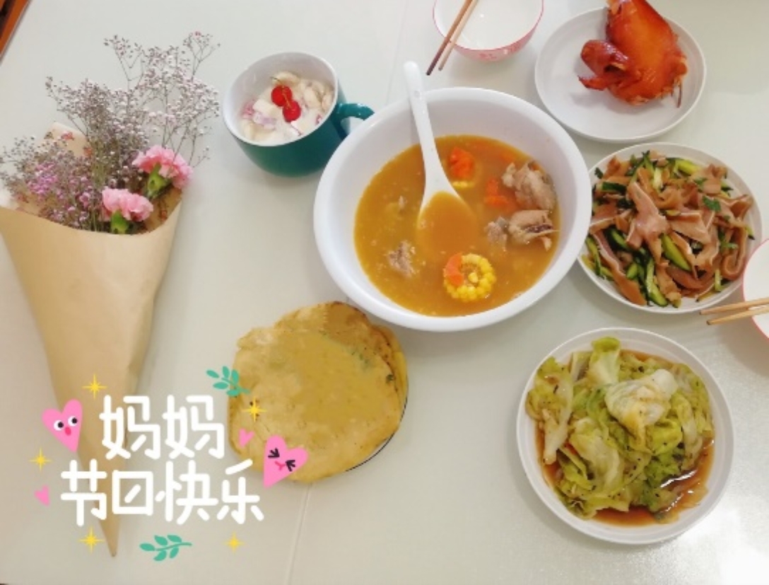 接下来是购买食材,准备做一顿丰盛的午饭,回家的时候手里提着大包小包,感慨还好自己臂力过人,不然真是提不动哦。今日健康食谱: 玉米排骨汤手撕包菜猪耳拌黄瓜水果捞葱花饼卤鸡。卤鸡是妈妈上午去姥姥家送母亲节礼物时姥姥给带回来的,其他是我自己做哒。