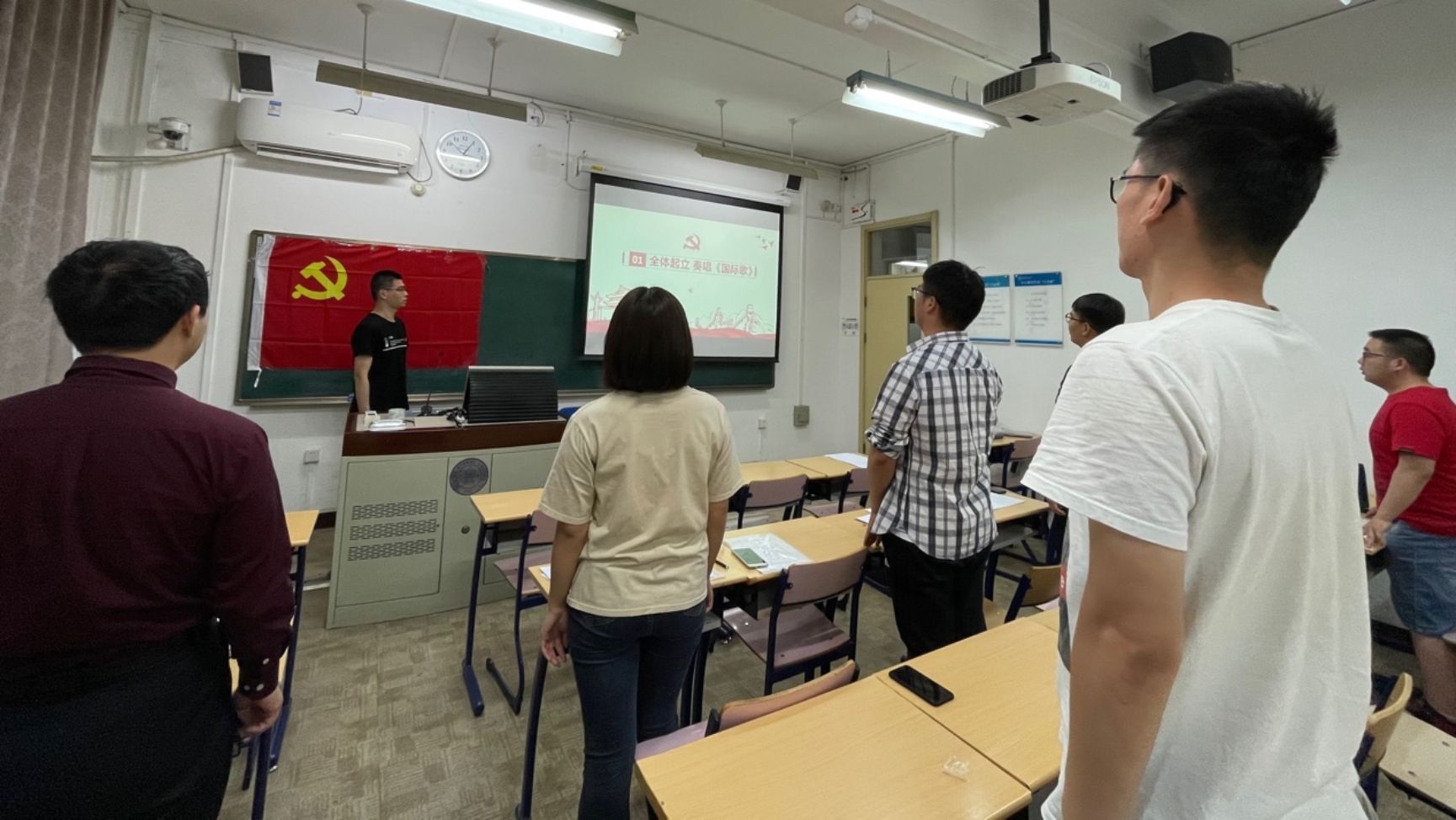 会议伊始,尹嘉宁同志首先介绍了会议流程,紧接着全体与会人员起立,面向党旗合唱《国际歌》。