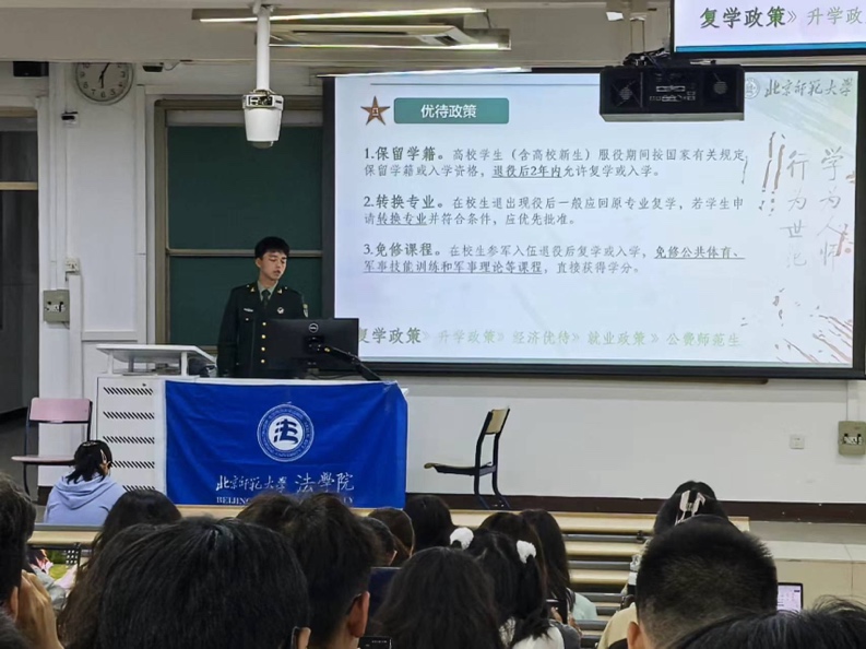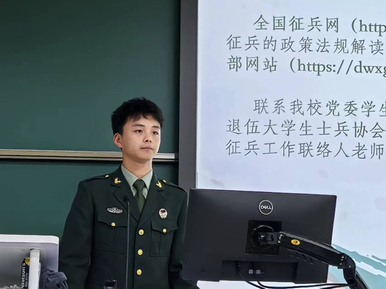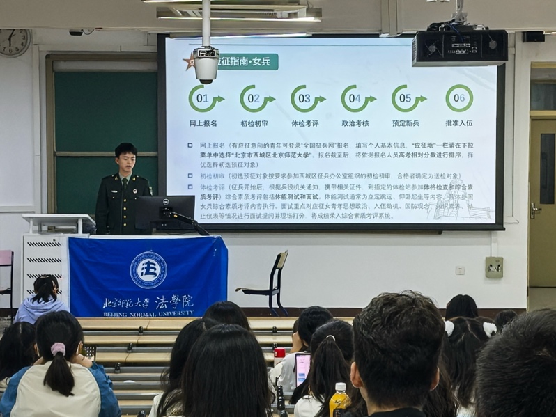 征兵宣讲会由徐淑琳老师主持。嘟嘟成人网 邀请我校体育与运动学院退役本科生王鸿为2024级本科新生进行宣讲。王鸿同学对参军入伍的条件标准、应征入伍基本流程等相关政策内容进行解读,并建议大家通过全国征兵网、嘟嘟成人网 党委学生工作部网站或京师学工公众号获取相关征兵信息。最后,王鸿师兄还鼓励大家积极响应国家号召,投身国防建设。