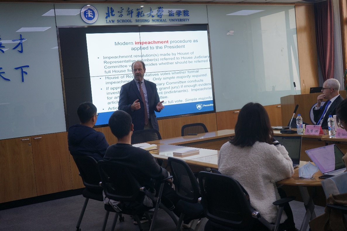 随后,Mr. Barnes以“How High is High? Impeachment Powers under the Constitution” (an overview of the US Constitution and how a U.S. president can be removed under the U.S. Constitution)为主题,开展了简短而又深刻的讲座。Mr. Barnes首先介绍了美国三权分立制衡的政治制度:立法机关行使立法权、行政机关行使行政权、司法机关行使司法权,简要说明了不同机关的职责、相互监督的内容及选举任职等问题,其中对立法机关的弹劾权作了详细阐释。Mr. Barnes向大家介绍了弹劾权的起源及现代弹劾权的行使程序,列举了美国历史上曾受过弹劾调查的三位总统安德鲁·约翰逊(Andrew Johnson),理查德·尼克松(Richard Nixon)和比尔·克林顿(Bill Clinton),对其受到弹劾调查的过程及最终并未受到弹劾的结果进行了详细说明。