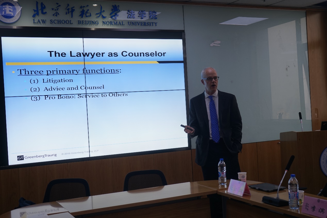 讲座第二部分由Mr. Kevin W. Rethore主讲。他向同学们分享了作为一名律师的执业经历,通过实际案例向大家介绍了其在诉讼、提供法律咨询及法律援助领域内的工作思路与工作内容。Mr. Barnes指出,对于今后将要走上法律道路的同学来说,要注意用自己的专业技能为需要帮助的人提供援助,鼓励大家今后多多参与法律援助。