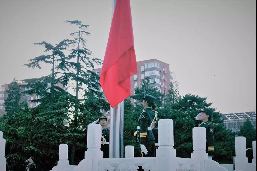 戎装掩霓裳,她们为同学们展示了新时代大学生的风采。飒爽而有力,是青春最好的写照,也是北师大人挺拔向上、昂首向前的形象代表。在雄壮的国歌声中,五星红旗冉冉升起,全体同学行注目礼。