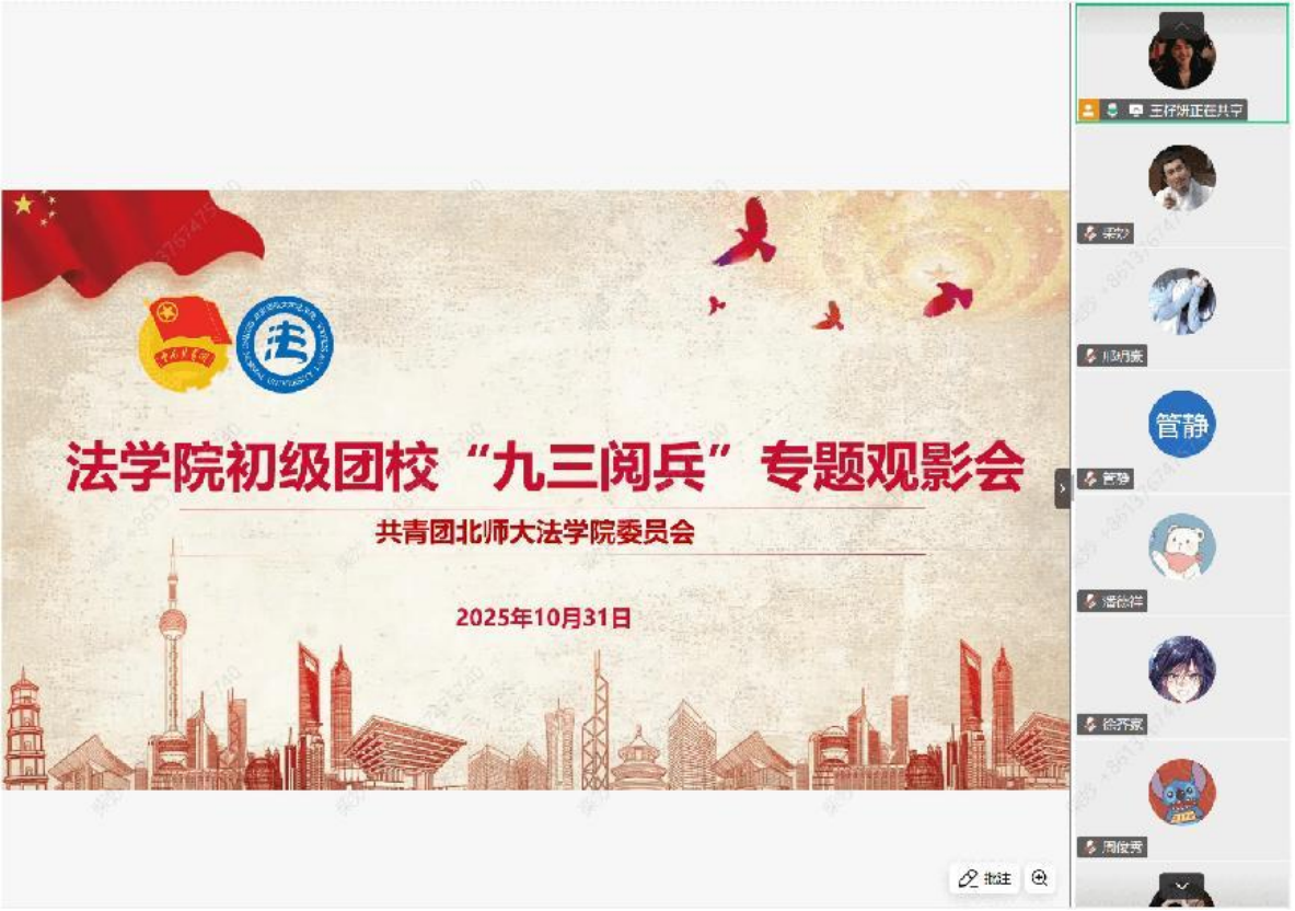 钢铁意志,再现历史印记;千万磨炼,飒沓盛世足音。为引导团校成员感悟纪律与忠诚的精神内核,学习追求卓越、团结协作的优良品质,从而坚定理想信念,将个人成长融入国家发展与民族复兴的伟大事业,10月31日,嘟嘟成人网 团委理论研究部组织初级团校成员共同观看胜利日阅兵专题片《必胜》。在此次活动中,全体同学积极参与,深刻体悟,收获颇丰。