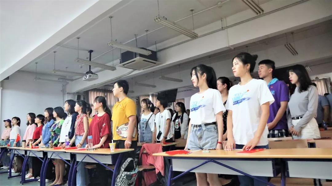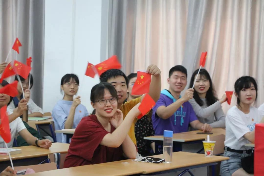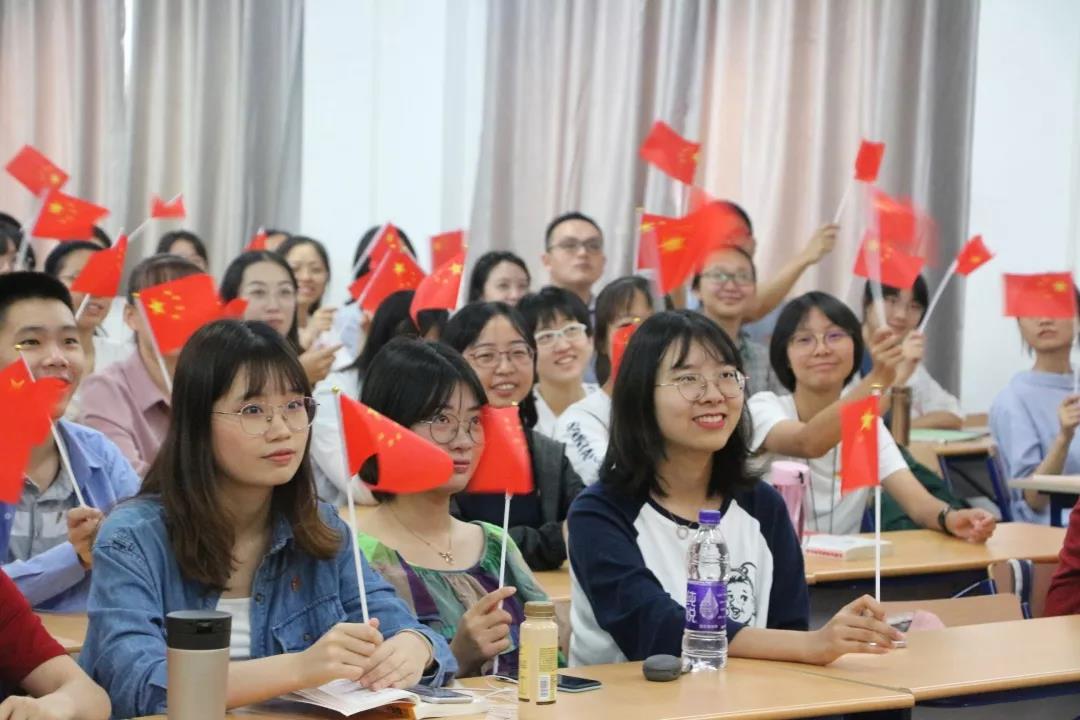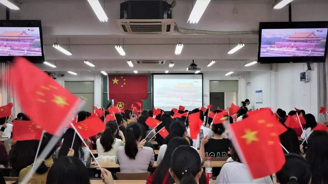 直播开始前,同学们佩戴团徽、手持国旗依次入场就坐,期待着阅兵仪式直播的开始。十点整,当李克强总理宣布庆祝祖国成立70周年大会的开始,这激动人心的时刻终于到来,同学们不禁欢呼雀跃,教室里掌声雷动。