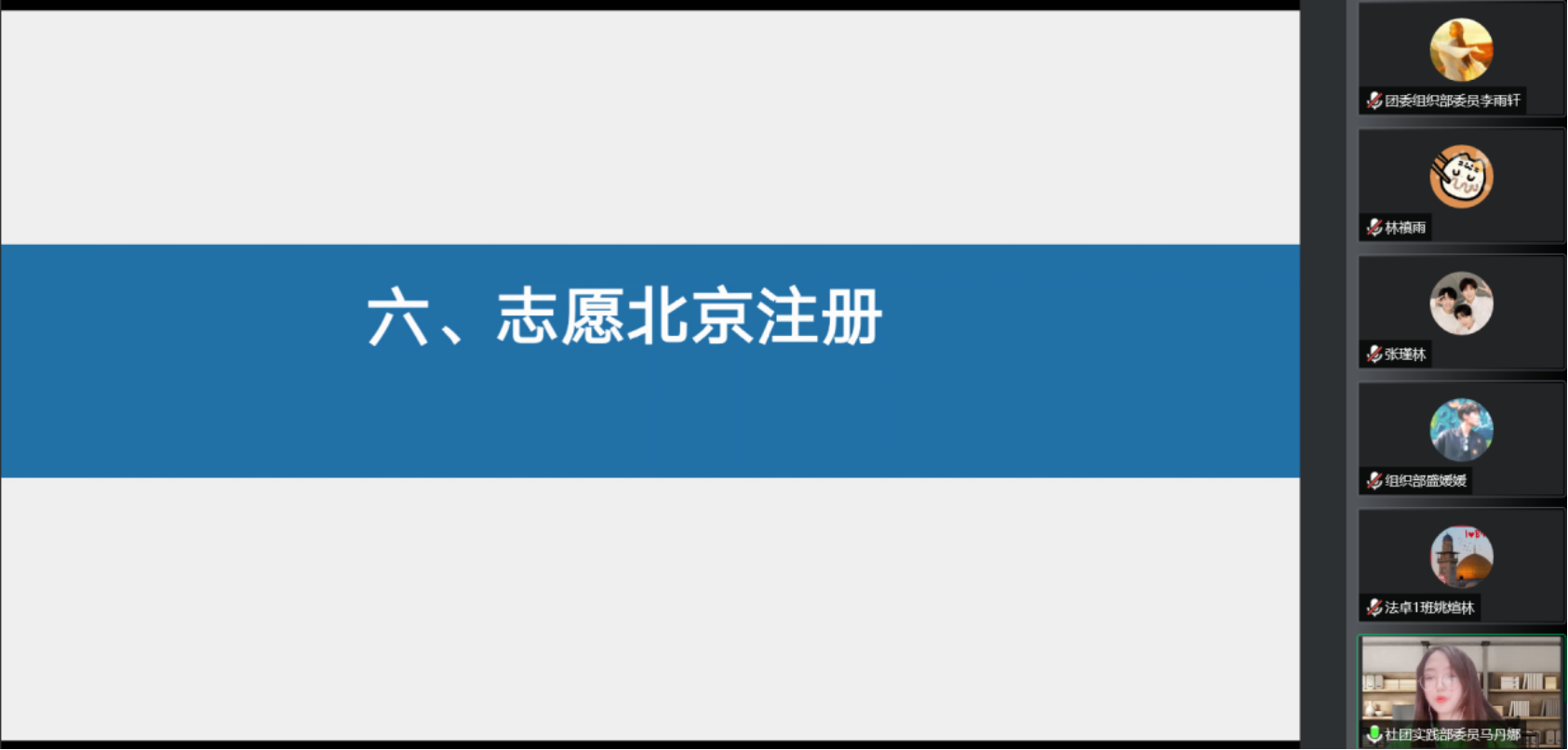 接着,社团实践部委员马丹娜为负责人介绍并演示了志愿北京注册和志愿时长录入的操作方法,强调了需要填写的关键信息,并针对可能遇到的如实名审核不通过、显示身份证号或邮箱已被注册和系统提示“无法加入项目”等常见的具体问题作出了详细的解答。
