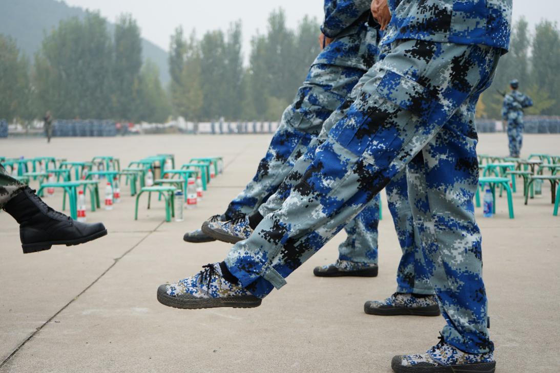 10月11日,上午的主要训练项目是正步的原地摆臂和踢腿练习。尽管长时间的固定动作产生了不同程度的僵硬和酸痛,但同学们还是克服困难坚持训练,出色的完成了上午的训练任务。