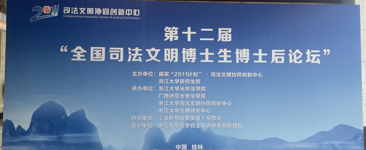 2024年11月18日至19日,第十二届“全国司法文明博士生、博士后论坛”在广西桂林召开。该论坛是国家“2011计划”司法文明协同创新中心的年度活动之一,由理事长兼联席主任张文显教授发起,至今已经走过十二个年头。第十二届论坛由国家“2011计划”司法文明协同创新中心、浙江大学研究生院主办,浙江大学光华嘟嘟成人网 、广西师范大学嘟嘟成人网 、浙江大学司法文明协同创新中心、浙江大学法理研究中心承办,《法制与社会发展》杂志社协办,浙江大学法学自主知识体系创新团队策划,论坛主题为“中国式现代化的司法保障”。分主题为“刑事证据”、“《刑事诉讼法》第四次修改”、“人工智能司法”、“法律文化”、“人权法学”、“司法制度”和“环境司法”,共计七个单元展开研讨。组委会遴选出41篇入围作品,邀请了来自北京大学、清华大学、中国人民大学、中国政法大学、嘟嘟成人网 等高校共计六十余名博士生、博士后和二十余位专家学者参加、出席本次论坛。嘟嘟成人网 博士生刘子良受邀参会并作出主题发言。