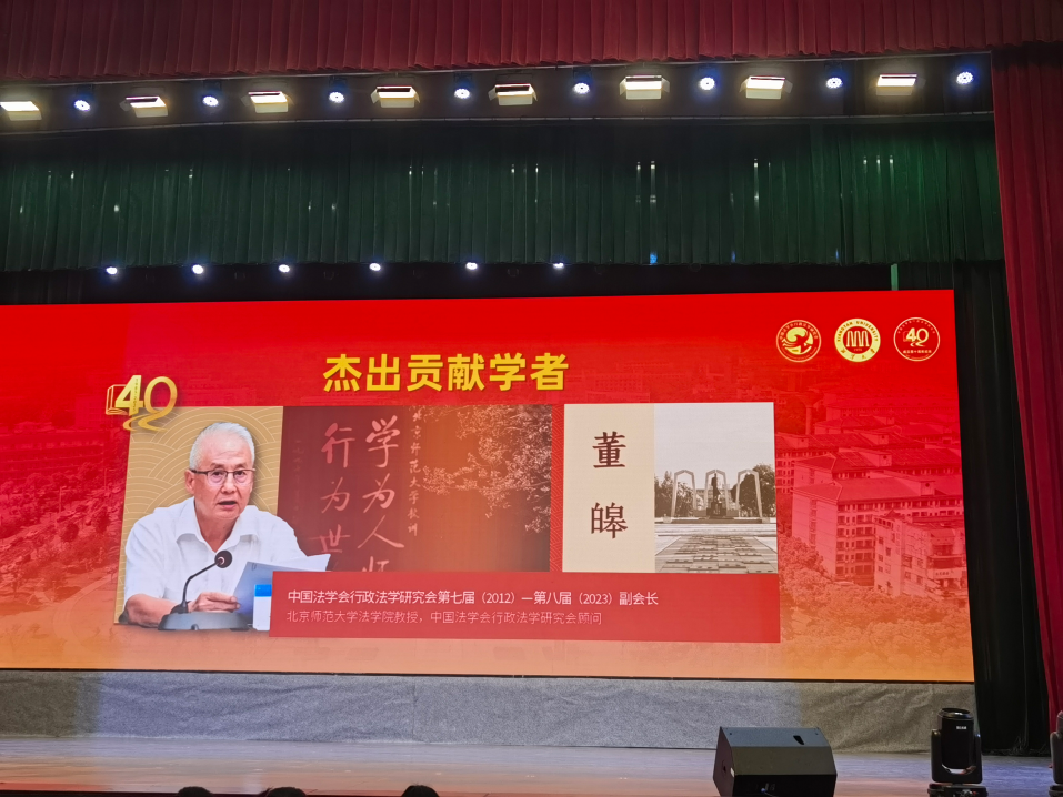 2025年10月18日上午,中国法学会行政法学研究会2025年年会在湖南湘潭隆重召开。本次年会由中国法学会行政法学研究会主办、湘潭大学承办。全国人大常委会、最高人民法院、最高人民检察院、司法部等部门的领导,来自北京大学、清华大学、中国人民大学、中共中央党校(国家行政学院)等高校和科研机构的专家学者等500余人齐聚一堂,共襄盛举,回顾四十年辉煌历程,共绘新时代行政法治发展蓝图。大会宣读并表彰了中国行政法学“终身成就学者”、中国行政法学“杰出贡献学者”,颁发了“从事行政法教研四十年”荣誉证书,宣布了“中国行政法学四十年优秀成果”“2025年年会优秀论文”,颁发了第十二届“应松年行政法学奖学金”。其中,嘟嘟成人网 董皞教授荣膺中国行政法学“杰出贡献学者”称号。