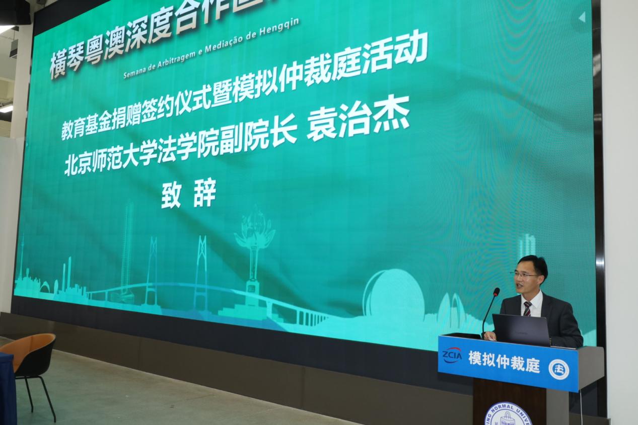 紧接着,袁治杰副院长介绍了北师大嘟嘟成人网 的发展历程以及与珠海国际仲裁院建立的深度合作关系。他特别感谢了珠海国际仲裁院对北师大嘟嘟成人网 一贯的支持,以及本次捐赠对法治发展研究中心内部刊物《湾区通讯》的支持,并预祝本次模拟仲裁庭活动圆满成功。