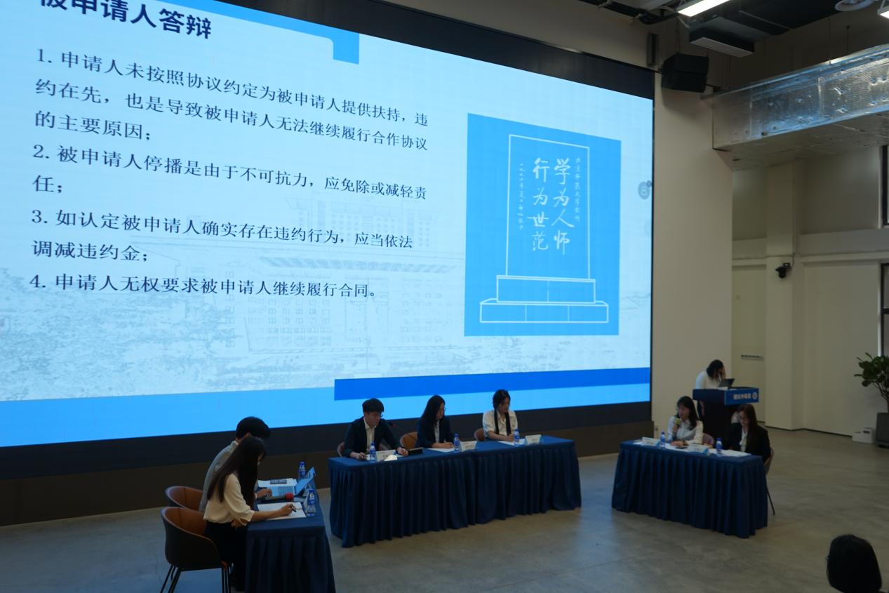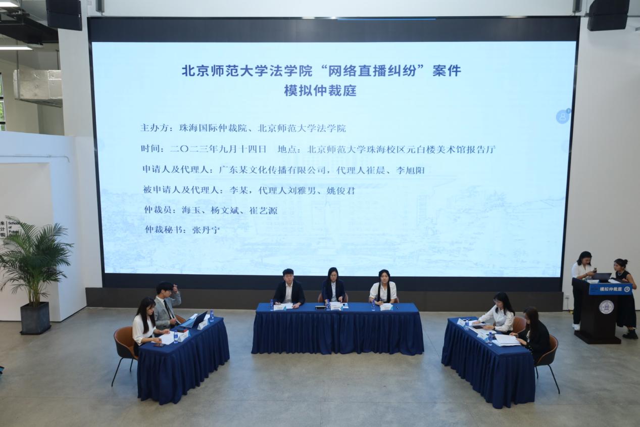 本次模拟仲裁庭审围绕一起“网络直播纠纷”案件展开,由珠海国际仲裁院副总监、仲裁二部负责人海玉担任首席仲裁员,带领北师大嘟嘟成人网 7名法律硕士进行模拟仲裁庭审。在本次模拟仲裁庭中,由杨文斌同学、崔艺源同学担任仲裁员,崔晨、李旭阳同学担任申请人及其代理人,刘雅男、姚俊君同学担任被申请人及代理人,张丹宁同学担任仲裁秘书。本次模拟仲裁庭审流程共分为八个环节,分别是:案情介绍;宣布开庭、核实当事人信息、告知权利义务;陈述请求和答辩阶段;举证及质证;庭审提问环节;辩论环节;最后陈述;宣布庭审结束。