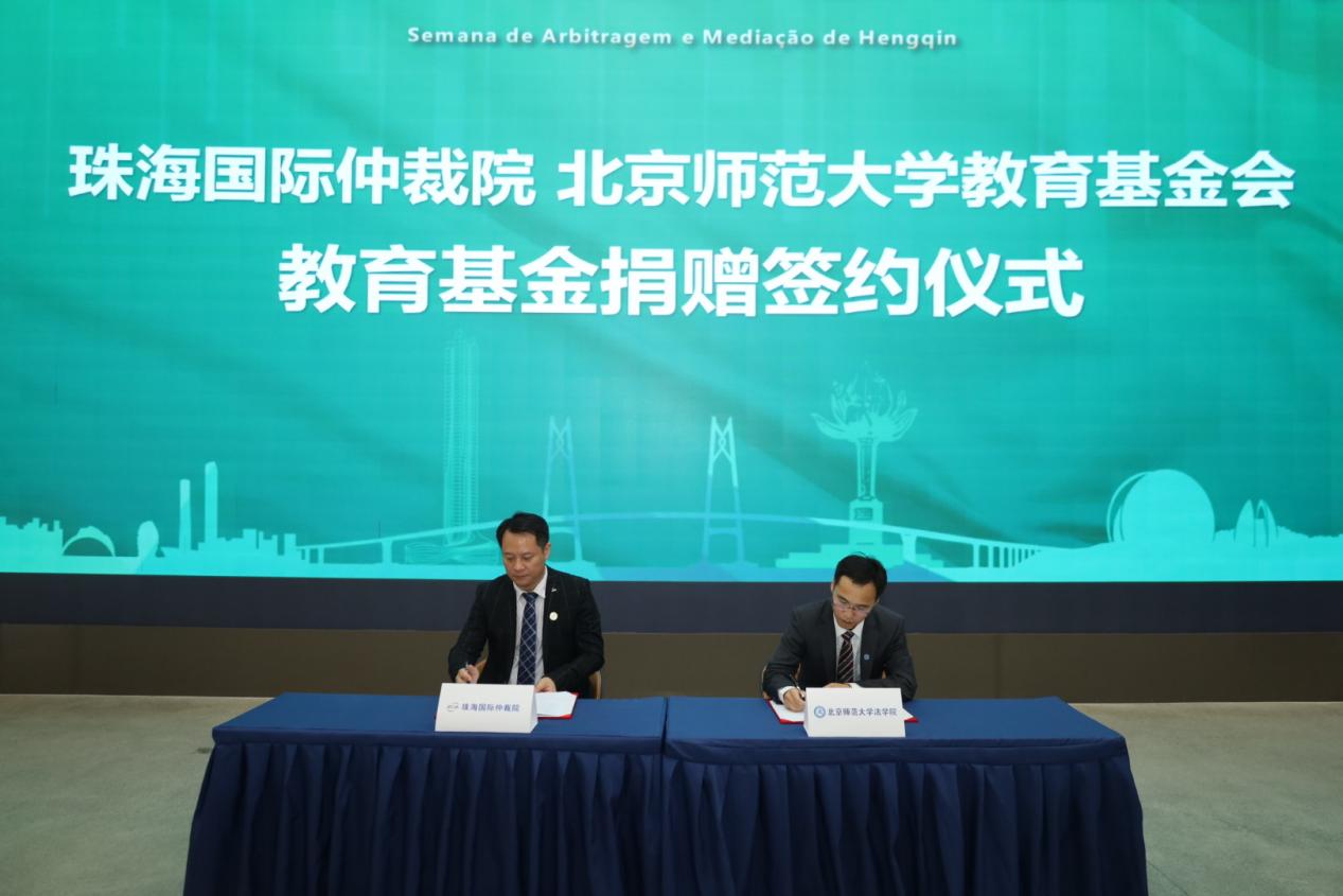 领导致辞完毕后,现场举行了珠海国际仲裁院与嘟嘟成人网 教育基金会签约仪式,王刚副院长和袁治杰副院长上台签约并合影。本次签约仪式能够进一步促进仲裁领域的人才培养和学术交流,为推动国际商事仲裁与调解的发展注入新的活力与动力。