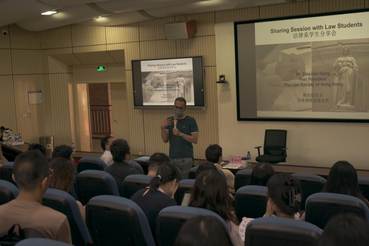 在赵文宗教授简要介绍了熊律师后,熊律师开始了他的分享,熊律师向同学们详细介绍了香港法律界概况、香港律师会的历史和发展、成为香港事务律师的途径以及正式成为香港律师后应承担的职责。他重点指出:香港的事务律师须恪守的道德标准和责任比法律所规定的更为严格,因此同学们在学习法律知识的同时切勿轻视道德品质的培养。